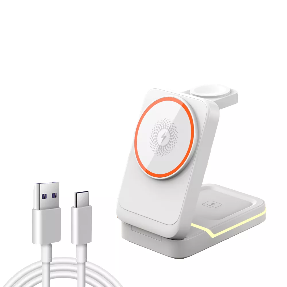Say goodbye to tangled cords and cluttered nightstands. This sleek 3-in-1 Magnetic Wireless Charging Station is your all-in-one solution for powering up your iPhone, Apple Watch, and wireless earbuds—all at the same time. Designed for Apple users, this foldable charging stand uses strong magnetic alignment to snap your devices perfectly into place for fast, secure charging.
